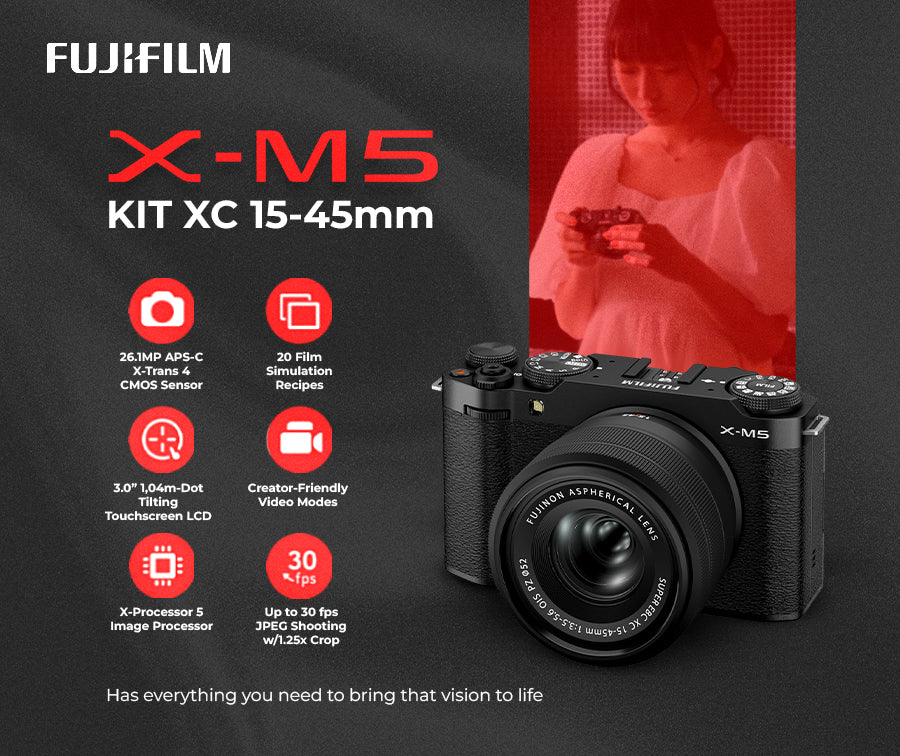 {"id":10188254708027,"title":"FujiFilm X-M5 Kit XC 15-45mm F3.5-5.6 OIS PZ","handle":"fujifilm-x-m5-kit-xc-15-45mm","description":"\u003ch4 data-start=\"228\" data-end=\"297\"\u003e\u003cstrong data-start=\"231\" data-end=\"297\"\u003eFujiFilm X-M5 – Kamera Mirrorless Canggih untuk Kreator Modern\u003c\/strong\u003e\u003c\/h4\u003e\n\u003cp data-start=\"299\" data-end=\"512\"\u003eTemukan kebebasan berkreasi tanpa batas bersama \u003cstrong data-start=\"347\" data-end=\"364\"\u003eFUJIFILM X-M5\u003c\/strong\u003e, kamera digital mirrorless yang menggabungkan desain klasik, dan hasil gambar menakjubkan dalam bodi yang ringkas dan ringan.\u003c\/p\u003e\n\u003cp data-end=\"323\" data-start=\"59\"\u003e\u003cstrong\u003eFujiFilm X-M5\u003c\/strong\u003e hadir dengan sensor X-Trans CMOS 4 dan mesin X-Processor 5 untuk hasil foto dan video yang jernih, detail, dan berwarna alami. Dilengkapi 20 mode Simulasi Film, Anda bisa berkreasi dengan tampilan warna khas Fujifilm hanya dengan satu putaran dial.\u003c\/p\u003e\n\u003cp data-end=\"580\" data-start=\"325\"\u003eAutofokus berbasis AI deteksi subjek mampu mengenali wajah, mata, hewan, kendaraan, hingga drone dengan presisi tinggi. Mendukung perekaman 6.2K\/30p 10-bit 4:2:2, 4K\/60p, dan Full HD 240p, menghasilkan video sinematik dalam bodi yang ringkas dan ringan.\u003c\/p\u003e\n\u003cp data-end=\"813\" data-start=\"582\"\u003eDilengkapi stabilisasi gambar digital, tiga mikrofon internal dengan fitur pengurangan derau, serta mode Film Pendek vertikal untuk konten media sosial. Koneksi USB-C, Wi-Fi, dan Bluetooth memudahkan transfer cepat ke smartphone.\u003c\/p\u003e\n\u003cp data-is-only-node=\"\" data-is-last-node=\"\" data-end=\"939\" data-start=\"815\"\u003eKamera ideal untuk vlogger, kreator konten, dan fotografer modern yang menginginkan performa tinggi dalam desain portabel.\u003c\/p\u003e\n\u003ch5\u003eSpecification\u003c\/h5\u003e\n\u003ctable style=\"width: 100%;\"\u003e\n\u003cthead data-start=\"177\" data-end=\"213\"\u003e\n\u003ctr data-start=\"177\" data-end=\"213\"\u003e\n\u003cth data-start=\"177\" data-end=\"195\" data-col-size=\"sm\" style=\"width: 32.1455%;\"\u003e\u003cstrong data-start=\"179\" data-end=\"194\"\u003eSpesifikasi\u003c\/strong\u003e\u003c\/th\u003e\n\u003cth data-start=\"195\" data-end=\"213\" data-col-size=\"md\" style=\"width: 67.4611%;\"\u003e\u003cstrong data-start=\"197\" data-end=\"211\"\u003eKeterangan\u003c\/strong\u003e\u003c\/th\u003e\n\u003c\/tr\u003e\n\u003c\/thead\u003e\n\u003c\/table\u003e\n\u003ctable style=\"width: 100%;\"\u003e\n\u003ctbody\u003e\n\u003ctr data-start=\"252\" data-end=\"281\"\u003e\n\u003ctd data-start=\"252\" data-end=\"264\" data-col-size=\"sm\" style=\"width: 31.8312%;\"\u003e\u003cstrong data-start=\"254\" data-end=\"263\"\u003eModel\u003c\/strong\u003e\u003c\/td\u003e\n\u003ctd data-start=\"264\" data-end=\"281\" data-col-size=\"md\" style=\"width: 67.7754%;\"\u003eFUJIFILM X-M5\u003c\/td\u003e\n\u003c\/tr\u003e\n\u003c\/tbody\u003e\n\u003c\/table\u003e\n\u003ctable style=\"width: 100%;\"\u003e\n\u003ctbody\u003e\n\u003ctr data-start=\"282\" data-end=\"320\"\u003e\n\u003ctd data-start=\"282\" data-end=\"300\" data-col-size=\"sm\" style=\"width: 32.1888%;\"\u003e\u003cstrong data-start=\"284\" data-end=\"299\"\u003eMount Lensa\u003c\/strong\u003e\u003c\/td\u003e\n\u003ctd data-start=\"300\" data-end=\"320\" data-col-size=\"md\" style=\"width: 67.5966%;\"\u003eFUJIFILM X Mount\u003c\/td\u003e\n\u003c\/tr\u003e\n\u003c\/tbody\u003e\n\u003c\/table\u003e\n\u003ctable style=\"width: 100%;\"\u003e\n\u003ctbody\u003e\n\u003ctr data-start=\"321\" data-end=\"383\"\u003e\n\u003ctd data-start=\"321\" data-end=\"341\" data-col-size=\"sm\" style=\"width: 32.01%;\"\u003e\u003cstrong data-start=\"323\" data-end=\"340\"\u003eSensor Gambar\u003c\/strong\u003e\u003c\/td\u003e\n\u003ctd data-start=\"341\" data-end=\"383\" data-col-size=\"md\" style=\"width: 67.7754%;\"\u003eAPS-C X-Trans CMOS 4 (23.5mm × 15.6mm)\u003c\/td\u003e\n\u003c\/tr\u003e\n\u003c\/tbody\u003e\n\u003c\/table\u003e\n\u003ctable style=\"width: 100%;\"\u003e\n\u003ctbody\u003e\n\u003ctr data-start=\"384\" data-end=\"426\"\u003e\n\u003ctd data-start=\"384\" data-end=\"407\" data-col-size=\"sm\" style=\"width: 32.545%;\"\u003e\u003cstrong data-start=\"386\" data-end=\"406\"\u003eResolusi Efektif\u003c\/strong\u003e\u003c\/td\u003e\n\u003ctd data-start=\"407\" data-end=\"426\" data-col-size=\"md\" style=\"width: 67.2404%;\"\u003e26.1 Megapiksel\u003c\/td\u003e\n\u003c\/tr\u003e\n\u003c\/tbody\u003e\n\u003c\/table\u003e\n\u003ctable style=\"width: 100%;\"\u003e\n\u003ctbody\u003e\n\u003ctr data-start=\"427\" data-end=\"466\"\u003e\n\u003ctd data-start=\"427\" data-end=\"449\" data-col-size=\"sm\" style=\"width: 32.1934%;\"\u003e\u003cstrong data-start=\"429\" data-end=\"448\"\u003eProsesor Gambar\u003c\/strong\u003e\u003c\/td\u003e\n\u003ctd data-start=\"449\" data-end=\"466\" data-col-size=\"md\" style=\"width: 67.592%;\"\u003eX-Processor 5\u003c\/td\u003e\n\u003c\/tr\u003e\n\u003c\/tbody\u003e\n\u003c\/table\u003e\n\u003ctable style=\"width: 100%;\"\u003e\n\u003ctbody\u003e\n\u003ctr data-start=\"467\" data-end=\"515\"\u003e\n\u003ctd data-start=\"467\" data-end=\"490\" data-col-size=\"sm\" style=\"width: 32.3212%;\"\u003e\u003cstrong data-start=\"469\" data-end=\"489\"\u003ePembersih Sensor\u003c\/strong\u003e\u003c\/td\u003e\n\u003ctd data-start=\"490\" data-end=\"515\" data-col-size=\"md\" style=\"width: 67.2853%;\"\u003eUltra Sonic Vibration\u003c\/td\u003e\n\u003c\/tr\u003e\n\u003c\/tbody\u003e\n\u003c\/table\u003e\n\u003ctable style=\"width: 100%;\"\u003e\n\u003ctbody\u003e\n\u003ctr data-start=\"516\" data-end=\"580\"\u003e\n\u003ctd data-start=\"516\" data-end=\"540\" data-col-size=\"sm\" style=\"width: 32.1873%;\"\u003e\u003cstrong data-start=\"518\" data-end=\"539\"\u003eMedia Penyimpanan\u003c\/strong\u003e\u003c\/td\u003e\n\u003ctd data-start=\"540\" data-end=\"580\" data-col-size=\"md\" style=\"width: 67