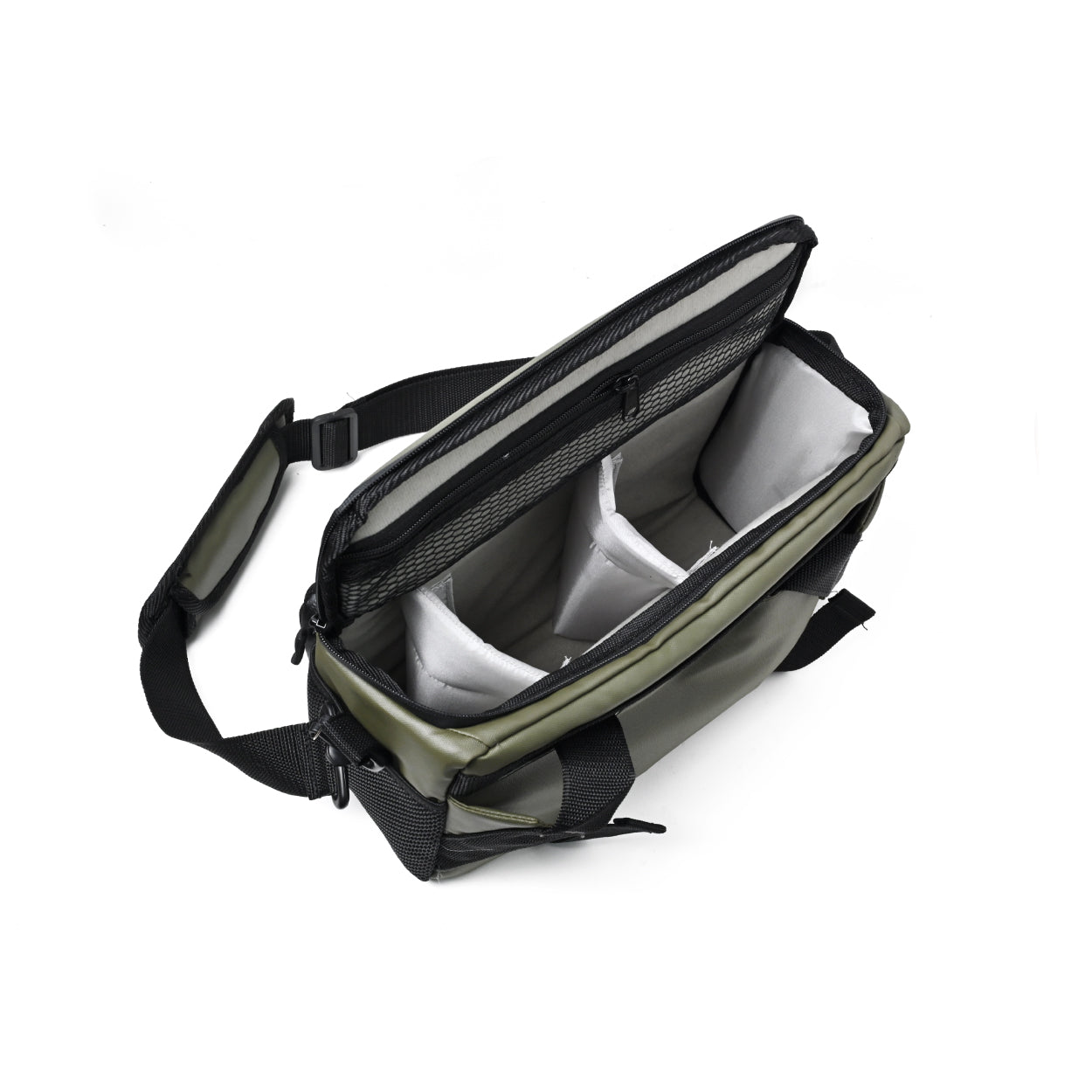 Bagian dalam memiliki sekat yang dapat diatur sesuai kebutuhan, serta saku tambahan untuk menyimpan baterai, kartu memori, atau aksesori kecil lainnya. Di bagian bawah tas terdapat tali khusus untuk membawa tripod, sehingga lebih praktis saat bepergian. Desainnya ringkas dan ringan, ideal untuk fotografi harian, traveling, dan street photography.